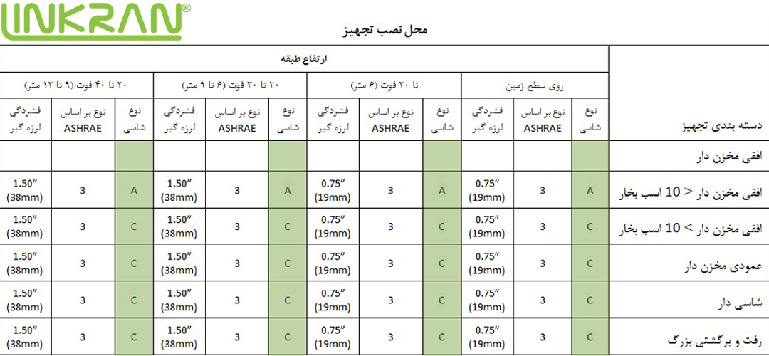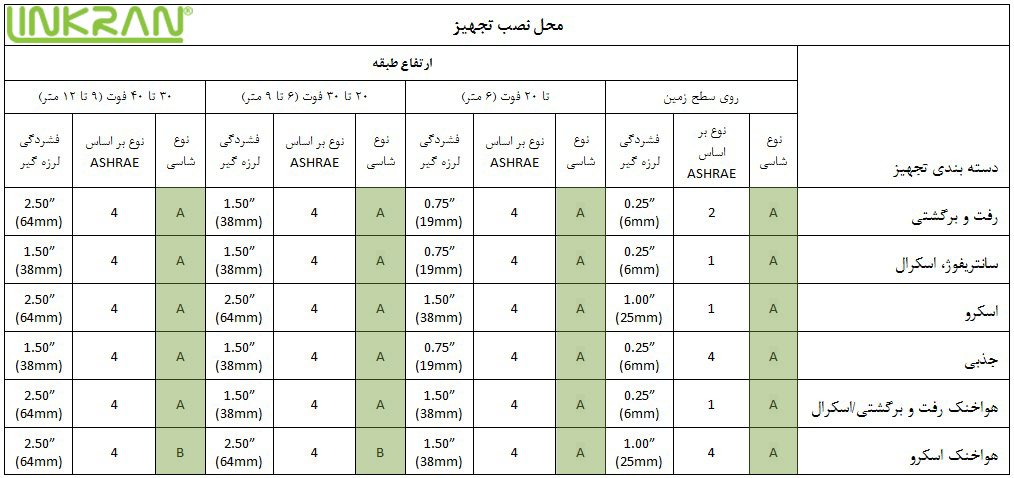 جدول زیر طریقه انتخاب انواع لرزه گیر صنعتی در قالب لرزه گیر برج خنک کننده را بر اساس دسته بندی تجهیزات و محل نصب آن ها مشاهده می کنیم.