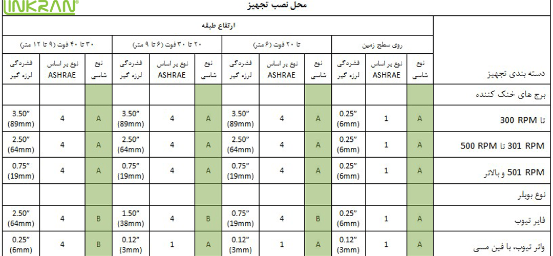 جدول استفاده از انواع لرزه گیر صنعتی در برج خنک کننده