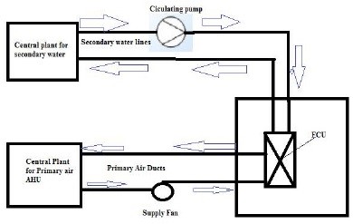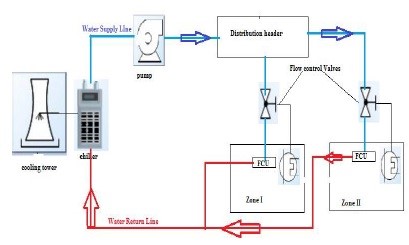 در این نوع سیستم HVAC همانطور که در شکل نشان داده شده است، مایع ناقل انرژی آبی است که انرژی را بین محل قرار گیری تجهیزات A/C و فضای مورد تهویه منتقل می کند.