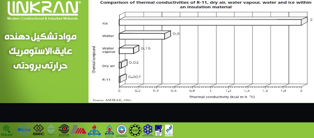 هدایت دمایی آب (در ۱۰ درجه سانتی گراد) معادل ۰.۵ kcal m h °C ودر یخ معادل ۲ kcal m h °C (حدود ۴ برابر بیشتر از آب) است، در حالی که در هوای خشک راکد حدود ۰.۰۲ kcal m h °C است. شکل زیر هدایت دمایی گاز R-11، هوای خشک، بخار آب و یخ را درون یک ماده عایق الاستومریک حرارتی برودتی نشان می دهد و بیان می کند که اگر هوا / گاز با بخار آب جایگزین شود چه افزایش معنا داری در هدایت دمایی روی خواهد داد.